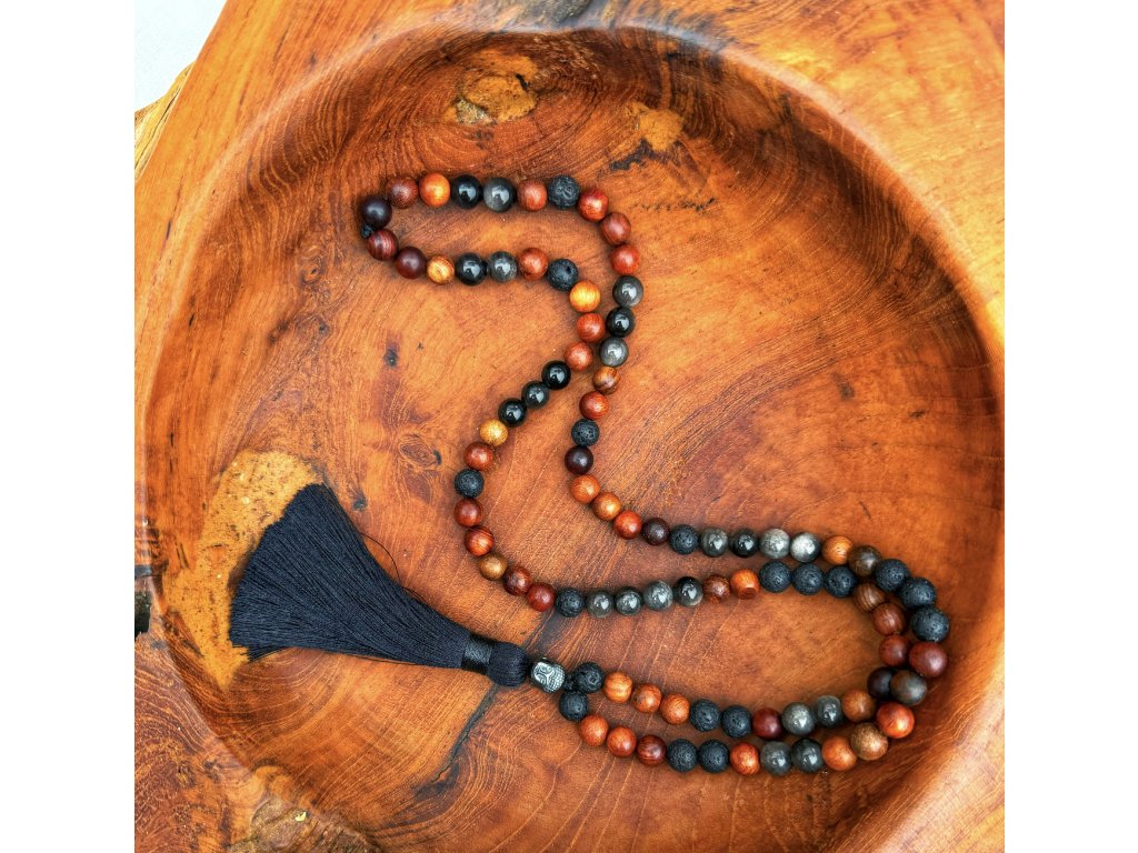 MATERIÁL: lávový kámen, obsidián, hruškové a palisandrové dřevo, 1 GURU korálek, nylonový provázek, autorský ocelový plíšek, hedvábný střapec