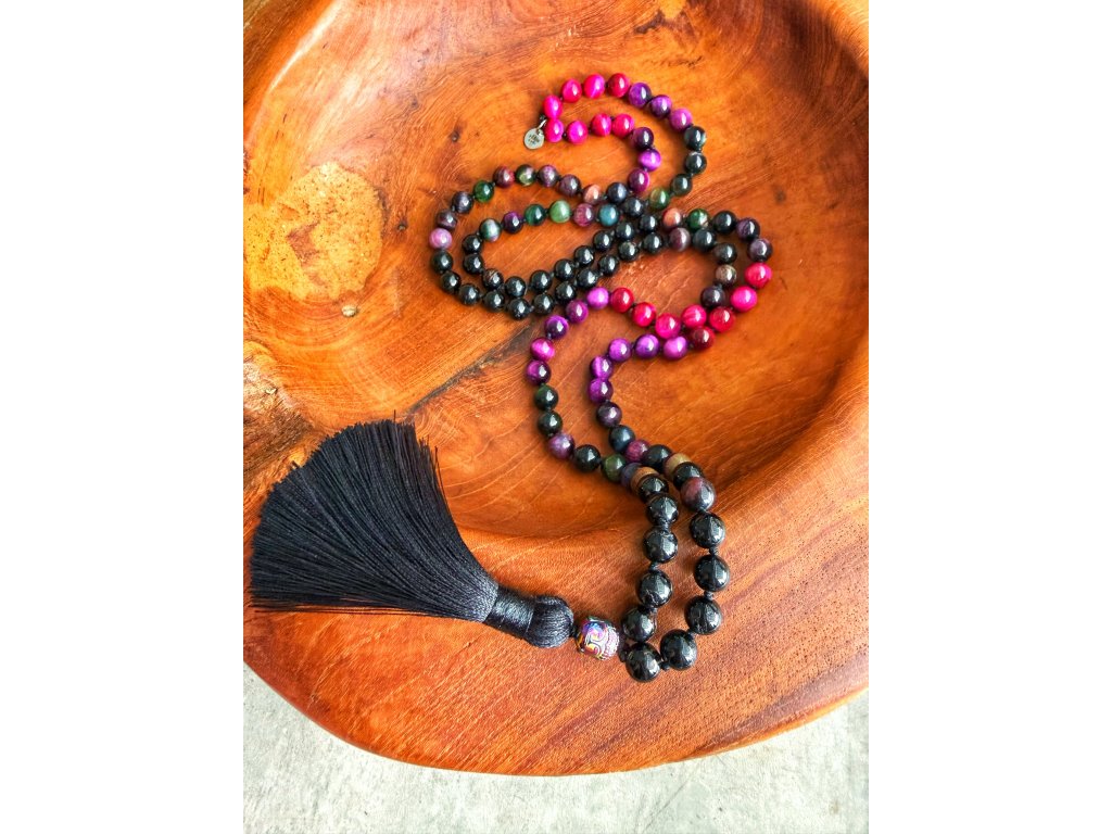 MATERIÁL:černý turmalín, tygří oko (dobarvované), 1 GURU korálek, nylonový provázek, autorský ocelový plíšek, hedvábný střapec