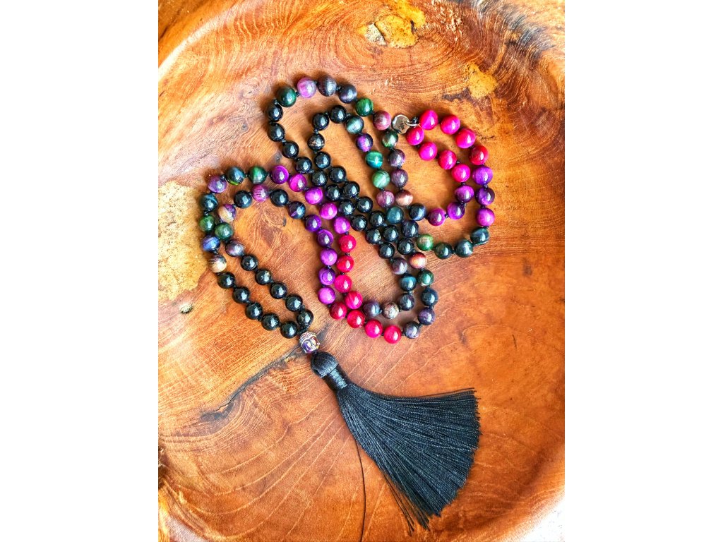 Tato japa mala má 108 korálků, jeden meditační a střapeček. Já k nim ještě dávám jedinečný autorský ocelový plíšek, který nikde jinde nenajdete.