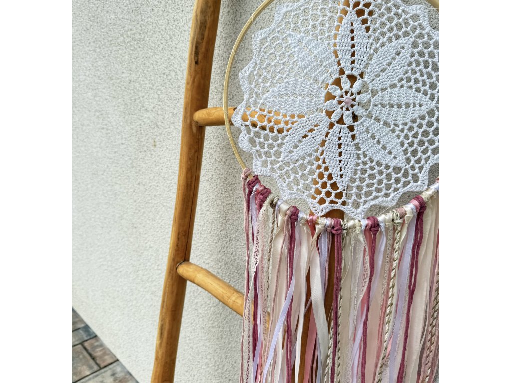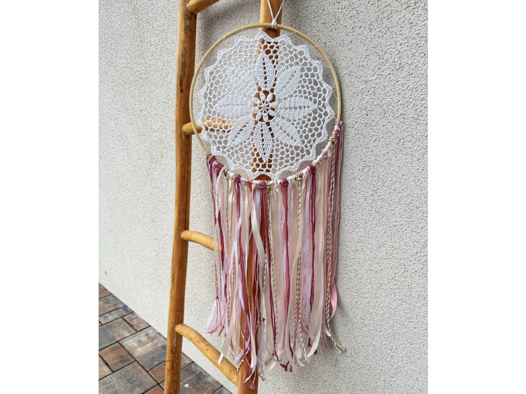 Tenhle lapač snů jsem vytvořila ručně, s velkou péčí a trpělivostí. Jeho srdcem je háčkovaná mandala, která symbolizuje klid, trpělivost a jemnou energii. Doplnila jsem ji o prýmky, stuhy a krajky, aby působil harmonicky a přinesl do prostoru lehkost.