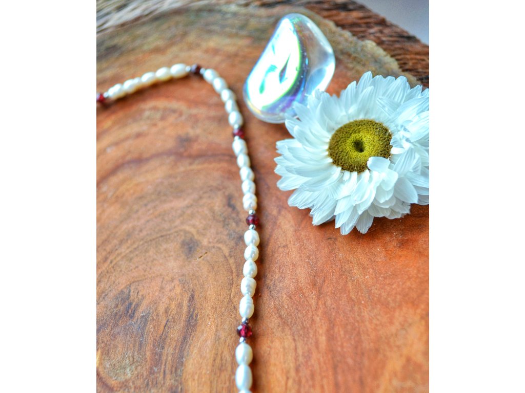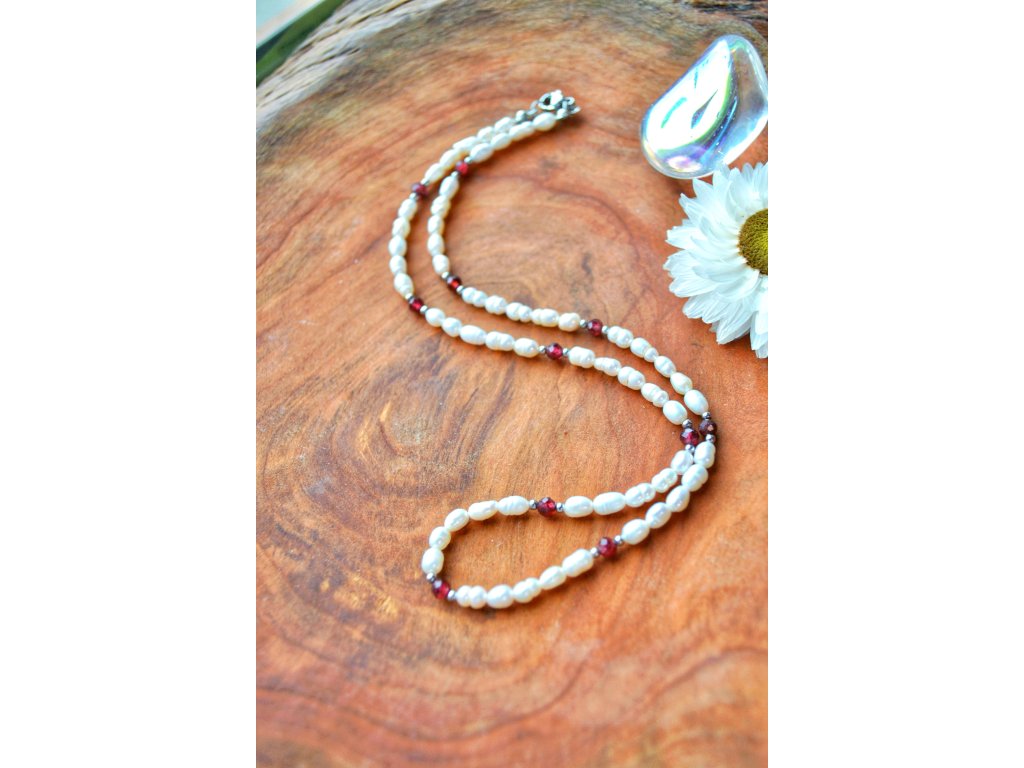 Říční perly jsou skvělé pro ženskou sílu, jemnost a mírnost. Přinášejí štěstí. Granát je kámen vhodný pro kořenovou čakru - pro fyzickou aktivitu, sebevědomí a odvahu.
